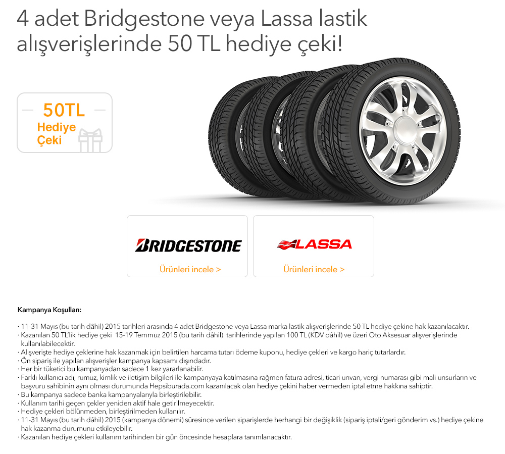 4 adet Bridgestone ya da Lassa markalı oto lastığı alışverişlerinizde 15-19 Temmuz tarihleri arasında yapacağınız 100 TL ve üzeri oto aksesuar alışverişlerinizde geçerli 50 TLHepsiburada hediye çekikazanabilirsiniz.